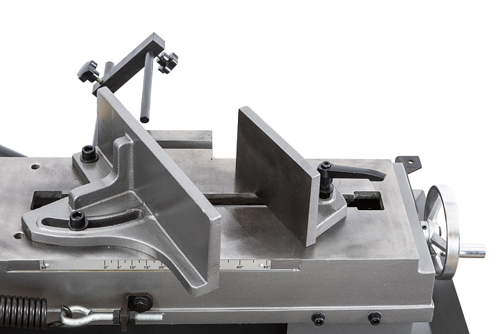 Ленточнопильный станок HVBS-712L является представителем линейки моделей американского типа, с поворотными губками тисков. Станок используется для работы как в небольших мастерских, так и на производстве с подключением к сети 230В. Конструкция ленточнопильного станка позволяет осуществлять распил круглых металлических заготовок под прямым углом, максимальный диаметр которых составляет 178 мм, под углом в 45° - 127 мм. Смена позиции заготовок для определения угла распила, осуществляется путем переустановки губок механических тисков в необходимое положение. Угол распила определяется в соответствии с делениями шкалы.