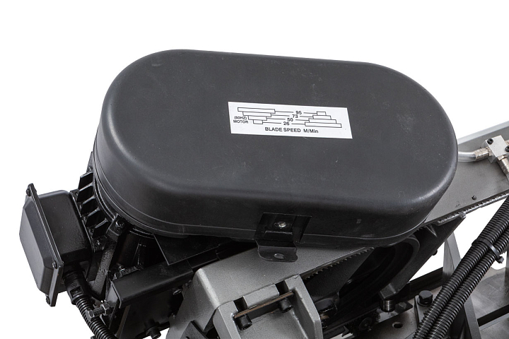 Моторная группа состоит из мощного электродвигателя - 1,1 кВт, обеспечивающего стабильную работу ленточного станка в различных скоростных режимах. Ременная передача позволяет осуществлять пиление заготовок на скоростях движения ленточного полотна в 26, 50, 73 и 95 м/мин. Управление работой станка осуществляется с пульта управления, установленного на консоли. Оборудование оснащено кнопкой аварийной остановки.