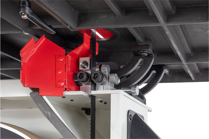 Натяжение ленты на колесах одним движением рычага. Большая ширина шкивов дает возможность установки широких пильных лент. Направление ленты при пилении двумя группами трехроликовых направляющих на шарикоподшипниках. Одна группа роликов расположена прямо над заготовкой и вторая – под столом. Стрелочный индикатор уровня натяжения поможет выбрать предварительный натяг пильной ленты. Отрегулировать натяжение до требуемого можно при помощи маховика на корпусе пилы под верхним/ведущим шкивом. Через смотровое окно необходимо проследить при первичной установке за сбеганием ленты. Лента должна находиться по центру и сбегание ее в любую из сторон недопустимо. Плавность хода и пиление без вибраций обеспечат чугунные шкивы с массивным телом. Они отбалансированы на заводе-изготовителе с использованием стендов компьютерной балансировки.