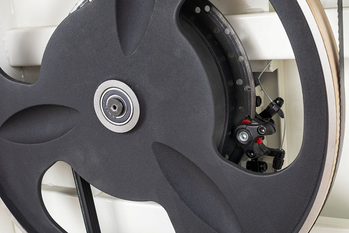 JWBS-18SFX оснащена особенной системы безопасной остановки пиления в экстренной ситуации. Эта система включает тормозной диск увеличенного диаметра, тормозной суппорт, педаль тормоза, трос-механизм торможения и концевой переключатель. Одновременно с нажатием педали-тормоза, срабатывает отключения электрической части двигателя через концевой переключатель и мгновенно останавливает подачу электричества двигателю. Одновременно с этим, колодки тормозят диск и соответственно колесо привода пильной ленты.