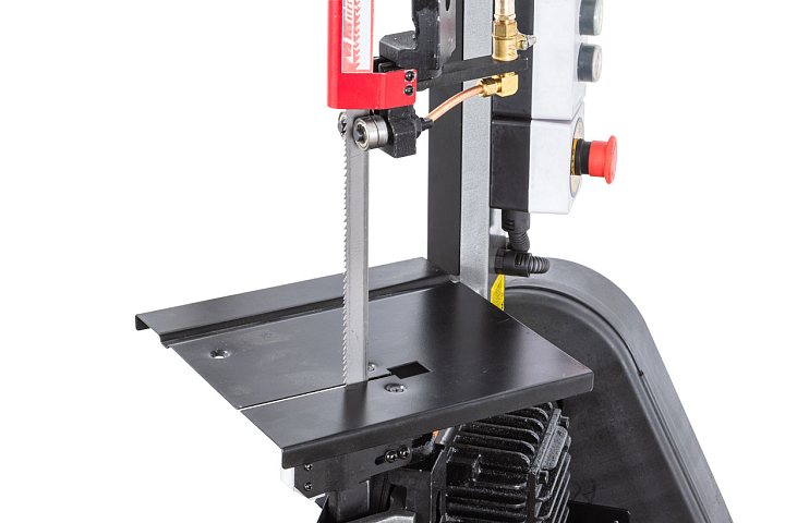 Модель оборудована кнопкой аварийной остановки двигателя, имеет тензометр, с помощью которого можно регулировать силу натяжения ленточной пилы.