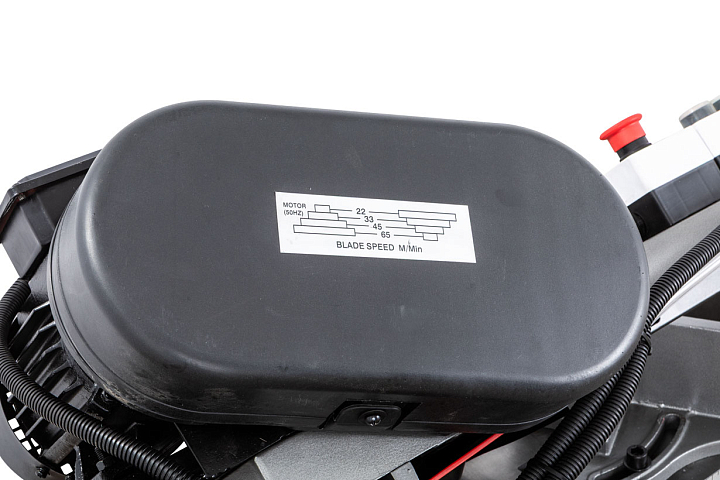 Ременная передача позволяет осуществлять смену скорости движения ленточного полотна. Станок может выполнять распил заготовок в четырех режимах скорости движения полотна 22, 33, 45 и 65 м/мин. Включение двигателя осуществляется через блок управления.